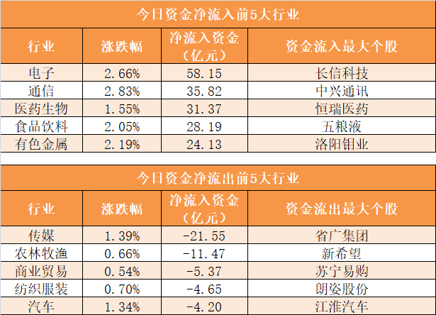 28个申万一级行业中,18个行业实现资金净流入,其中电子行业净流入58.15亿元居首。