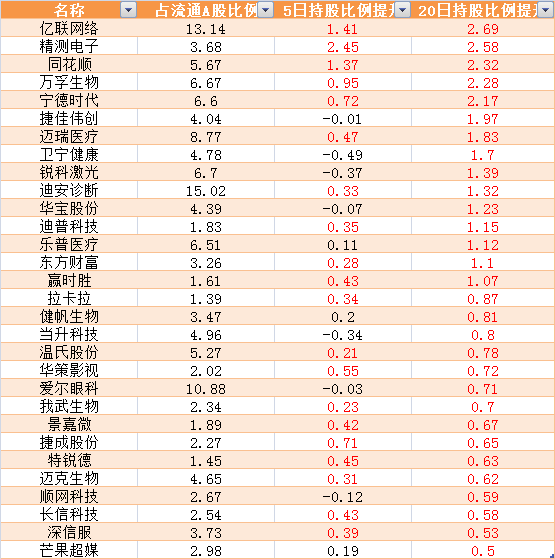 最新数据显示,创业板指成分股中,亿联网络、精测电子、同花顺、万孚生物、宁德时代近20日增仓力度居前,北向资金持股占流通股的比例均超过2%,且近5日亿联网络、精测电子、同花顺在近5日持股比例提升超过1%,万孚生物、宁德时代持股比例分别提升0.95和0.72%。