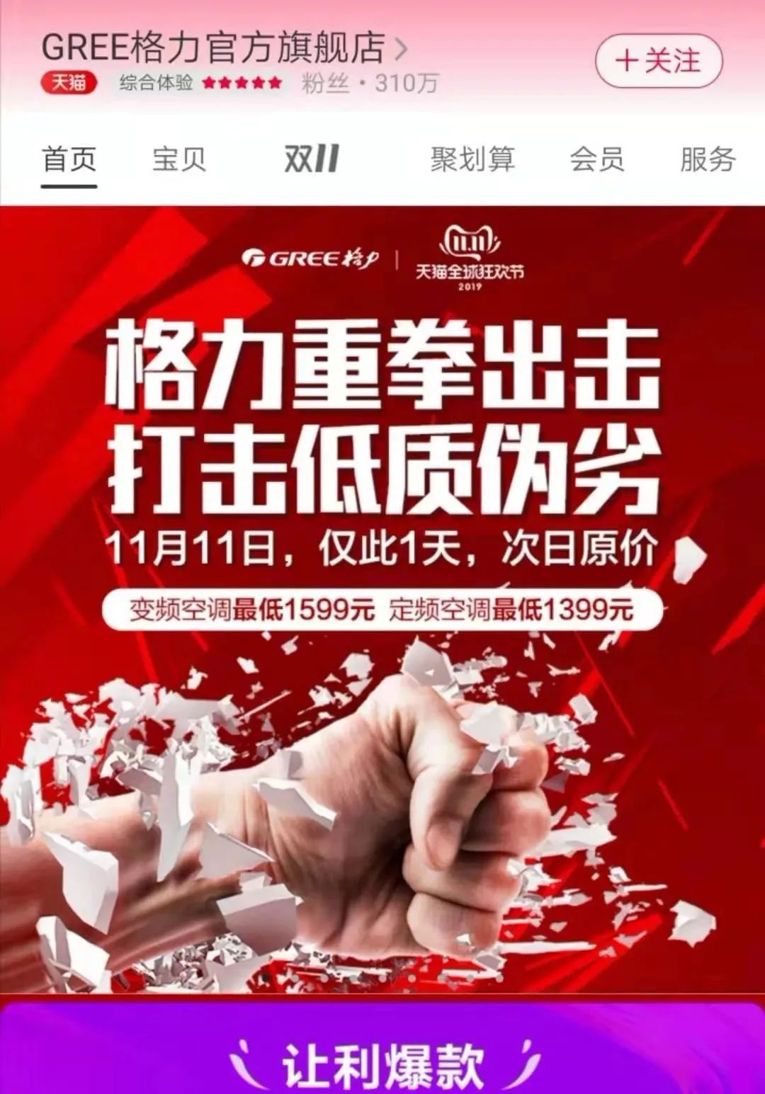 11月9日晚,格力电器在官方微博发布公告称,“双11”将让利30亿元打击低质伪劣产品。具体而言,格力变频空调最低1599元,定频空调最低1399元,总让利高达30亿元。
