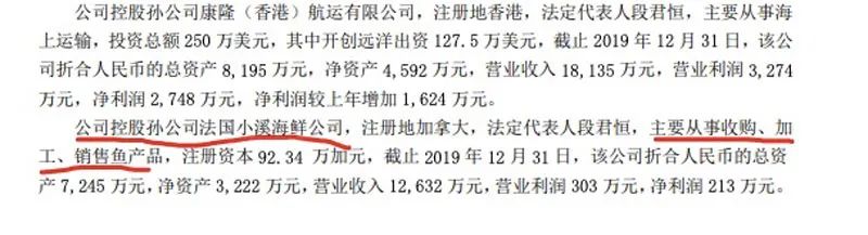2019年1月31日,公司全资子公司开创远洋完成收购 French Creek Seafood Ltd.(法国小溪海鲜公司,下称“FCS”)70%股权。资料显示,FCS主要从事收购、加工、销售鱼产品。
