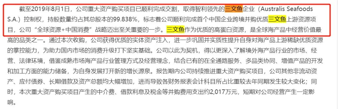 由公告可知,佳沃股份的三文鱼业务系去年并购而来。公司在2019年半年报中曾披露,经过重大资产重组项目,公司完成了我国企业对三文鱼上游稀缺生物资源的首次大规模收购。