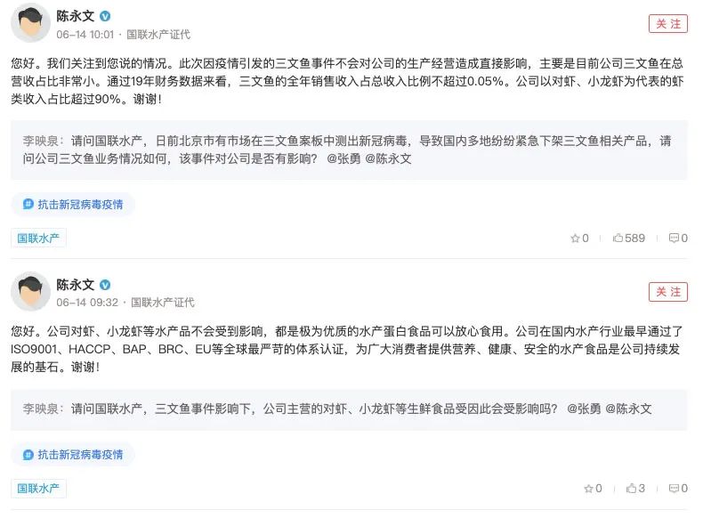 对于一种投资者的追问,6月14日,国联水产证券代表陈永文紧急回应称“影响可忽略不计”。