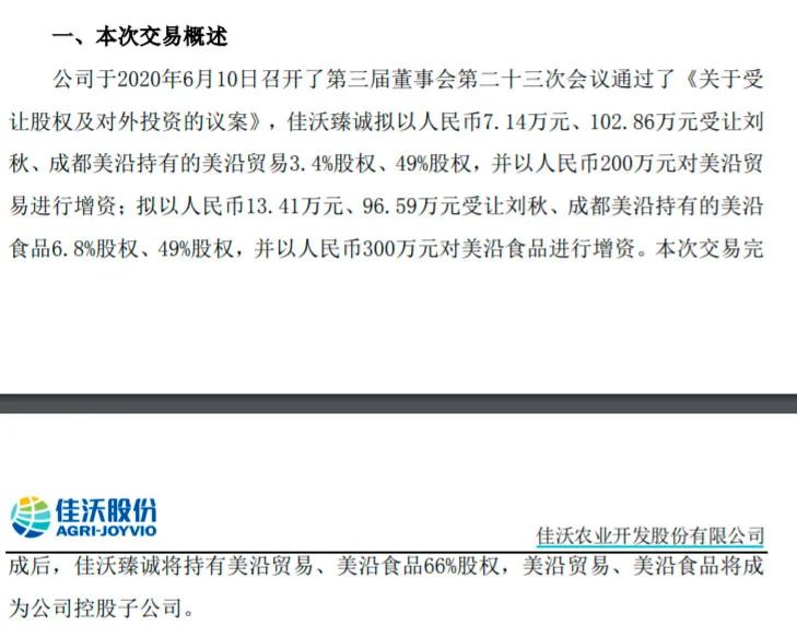 或是对于三文鱼业务长期的发展具有足够的信心,就在6月10日晚,佳沃股份还披露其全资子公司佳沃臻诚的投资方案,佳沃臻诚拟以220万元收购美沿贸易和美沿食品过半股权,并对两家公司共计增资500万元。