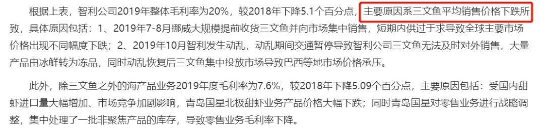 对于去年业绩的下滑,深交所也发出年报问询函,就三文鱼产品毛利率问题提出疑问。公司的回应是:价格下跌所致。