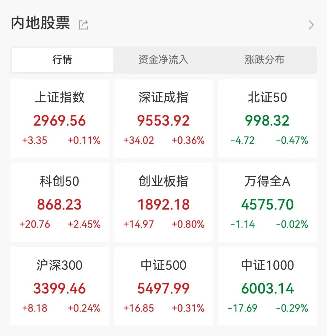 12月8日,A股三大指数集体走强。沪指震荡反弹,收涨0.11%,报2969.56点。创业板指走势亮眼,午后一度涨逾1%。截至收盘,深证成指涨0.36%,创业板指涨0.8%。