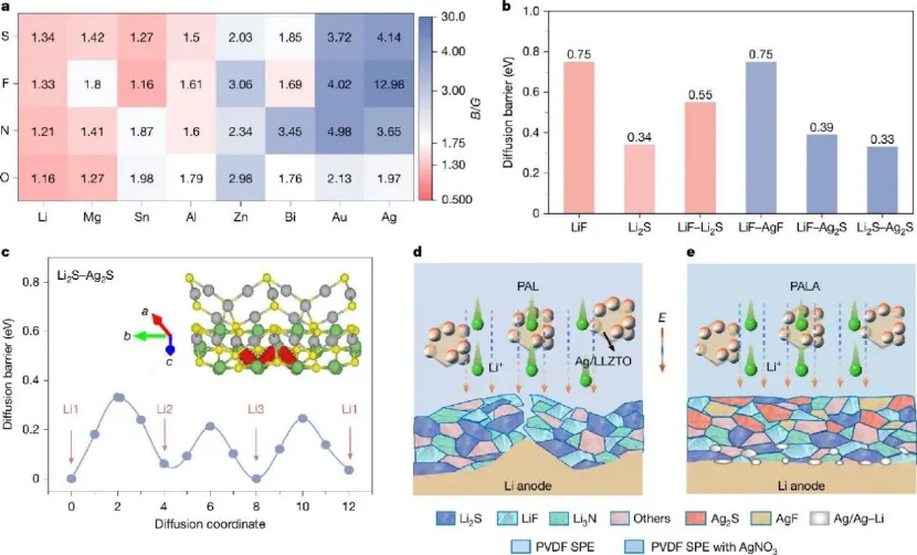 团队从SEI结构和模型进行源头创新,将“塑性”特征作为新型SEI组分筛选的核心指标,并进行了人工智能加速的理论筛选,发现硫化银、氟化银等材料不仅具备良好的塑性变形能力,还能显著降低锂离子的扩散能垒。