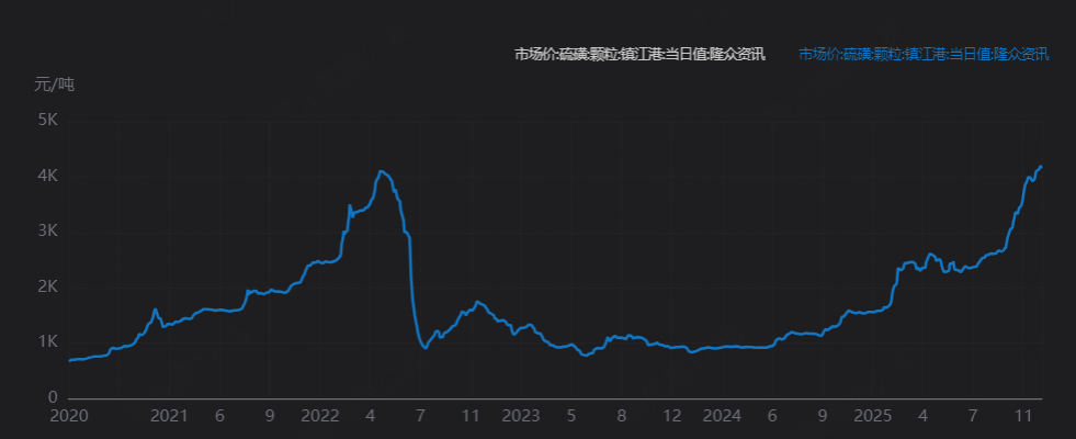 硫磺最主要应用为制备硫酸,二硫化碳、蔗糖制备、冶金等领域同样需要硫磺。国内93%的硫磺被用来制备硫酸,进而应用于磷肥、钛白粉、己内酰胺等产品制备。约7%左右的硫磺被用于二硫化碳制备、蔗糖脱色、冶金、染料中间体制备等领域。硫磺最重要的下游应用为制备硫酸,硫酸有“工业之母”之称。硫酸下游应用中,化肥用酸约占一半,此外硫酸在化工、冶金、医药等领域同样有着重要应用。硫酸的主要有硫磺制酸、冶炼烟气制酸和硫铁矿制酸三种工艺。据百川盈孚数据,2025年1-10月,我国硫酸表观消费量为8794万吨,同比增长5.21%。今年硫酸消费量保持了中高速增长。今年以来硫磺价格持续上涨,据化工在线数据,2025年12月12日,国内固态硫磺现货价为4150元/吨,同比去年+167%。硫磺的景气度持续这么高的原因是啥?本文试图去做了分析。