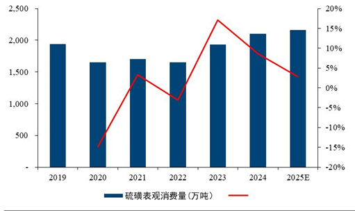 中国硫磺产量及表观消费量均呈现趋势上升。我国硫磺随炼化能力提升逐步提高,2024年我国硫磺产量为1106.7万吨,同比上升5.18%,2025年前10个月,我国硫磺产量为974.6万吨,同比上升6.45%。表观消费量方面,2024年我国硫磺表观消费量为2101.6万吨,同比上升8.61%。据百川盈孚预测,2025年我国硫磺表观消费量可达2161.2万吨,同比微增2.83%。2024年我国硫磺表观消费量为2101.6万吨,同比上升8.61%。据百川盈孚预测,2025年我国硫磺表观消费量可达2161.2万吨,同比微增2.83%。