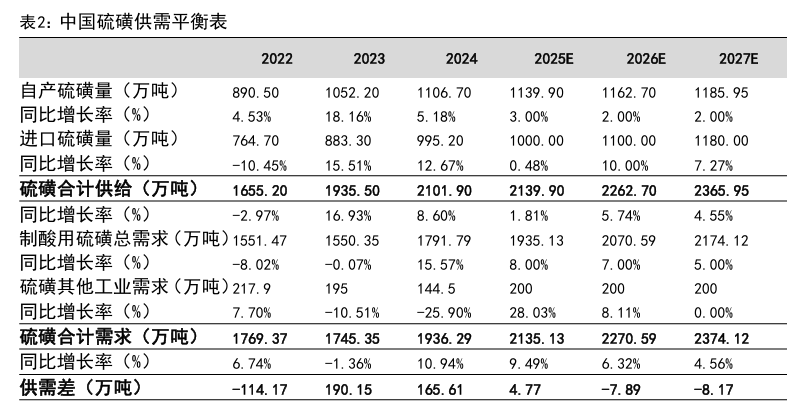 整体看,硫磺涨价持续性的核心还是国内原油炼厂的关闭,中小炼厂因为国家规定,关闭,我国原油一次加工能力上限为10亿吨,导致硫磺复产减少,未来炼油副产硫磺增量较低。我国自产天然气仍保持6%左右的增长水平,机构预计2025-2027年自产硫磺产量增速分别为3%、2%、2%。进口硫磺方面,2025年俄罗斯硫磺生产和出口下降对全球硫磺贸易造成影响,硫磺价格快速上升,结合前期数据,我们预测2025年硫磺进口量为1000万吨。展望2026年,我们预计在今年硫磺进口低基数效应下,明年硫磺进口增速有望达10%,2027年进口硫磺增速预计为7%左右。硫磺需求方面,国内烟气副产酸增量较低,硫铁矿制酸产能占比小,国内硫酸需求增量仍主要靠硫磺制酸提供。综合硫转化率及收率我们假设1吨硫磺制备2.85吨硫酸,我们预计2025-2027年国内制酸硫磺需求量分别为1935.13、2070.59及2174.12万吨。其他工业需求用硫磺分别为200、200、200万吨。根据以上假设,2026-2027年,国内硫磺出现7.89及8.17万吨缺口。预期未来一段时间硫磺的价格还将保持在高位水平运行。