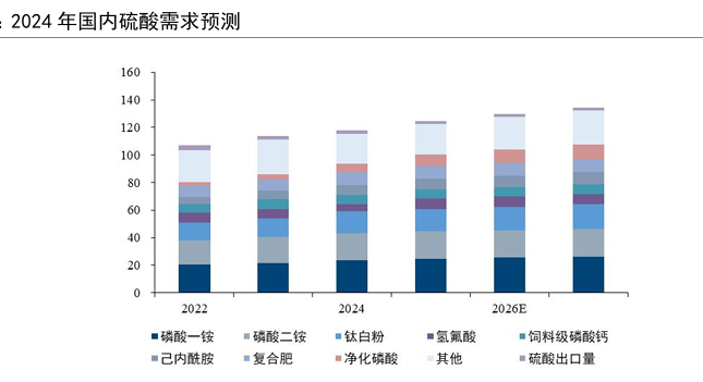 我们预计2025年国内硫酸需求增速在5%左右,未来两年增速约为4%。我国硫酸需求基本盘较为稳定,农用磷肥需求增速预计为1%-2%。钛白粉、氢氟酸等传统化工产品预计保持低速增长。新能领域对磷酸一铵及净化磷酸需求增量较大。根据以上假设我们测算得到2025年我国硫酸消费预计为1.25亿吨,同比增长5.6%。2026-2027年硫酸需求分别为1.30和1.34亿吨,增速分别可达4.1%和3.5%。