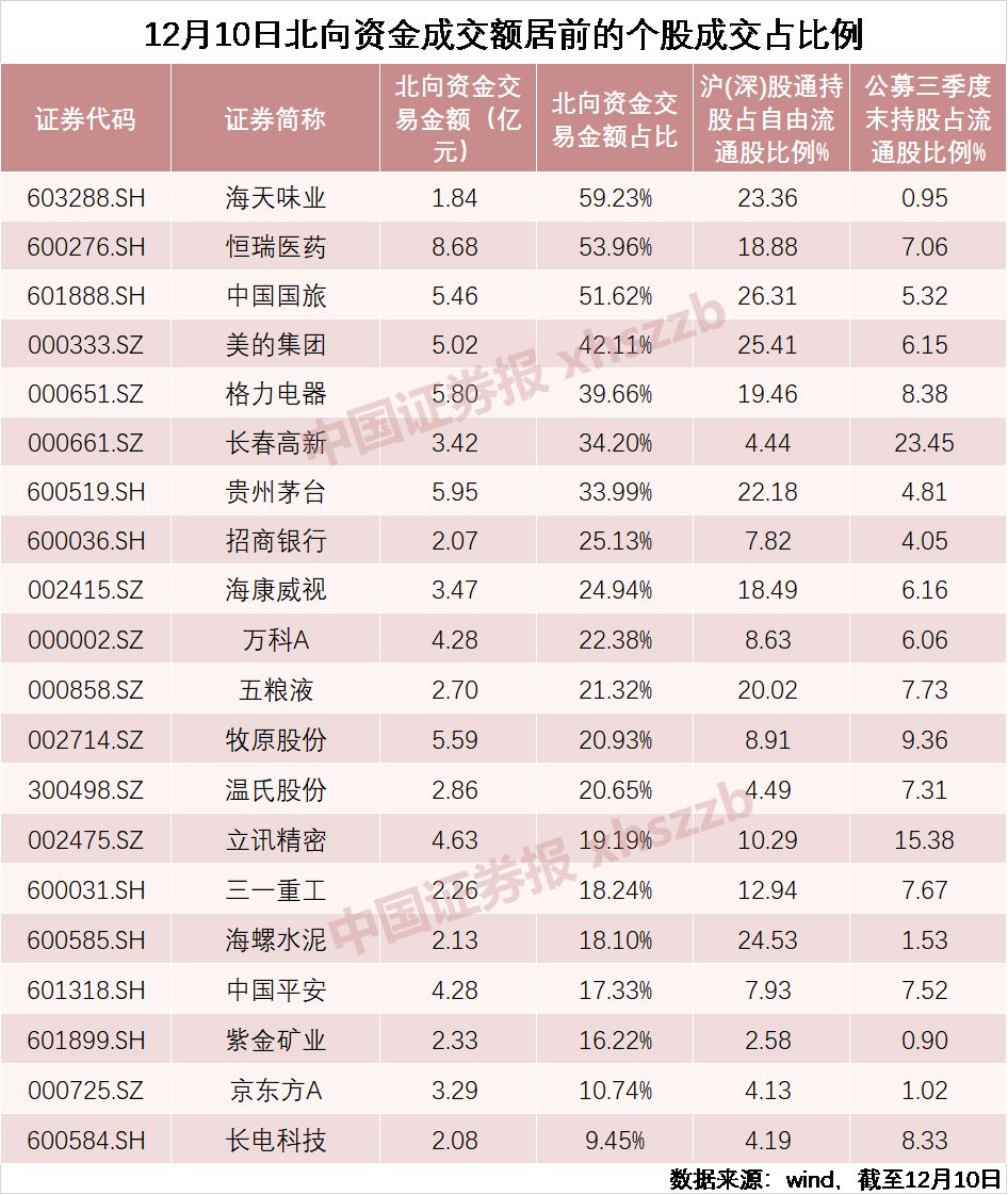 Wind数据显示,从12月10日的沪深股通前十大成交个股看,北向资金对不少个股的成交额已经占到当日成交额的30%以上。具体看,北向资金贡献了海天味业59.23%的交易额,对恒瑞医药、中国国旅的成交额占比也都超过50%。