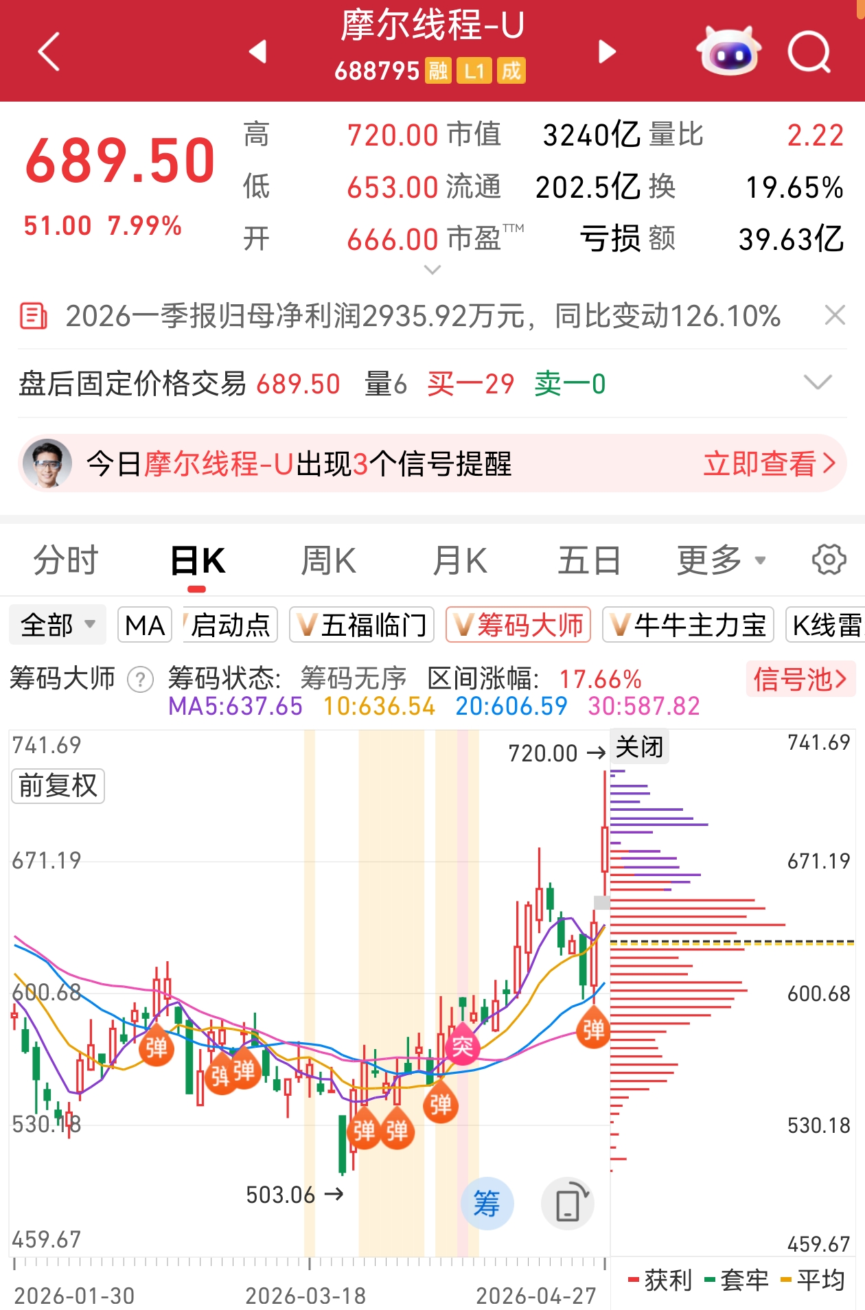 注:主升浪并非完全无迹可寻!“筹码大师”显示,国产GPU巨头摩尔线程前期连续密集出现“突”、“弹”信号,短短一个多月时间里,合计出现“突”信号1次,出现“弹”信号6次,最后一次出现正是在4月24日上周五,随后今天继续拉出大阳线!那么,你的股有没有强势信号出现?还有哪些股出现了强势信号呢?更多学习案例参考,尽在“筹码大师”!点击详情>>