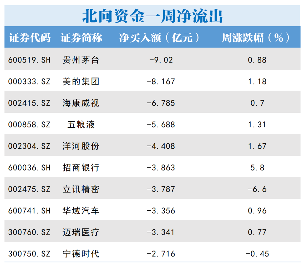 净卖出额居前三的是贵州茅台、美的集团、海康威视,净卖出额分别是9.02亿元、8.167亿元、6.788亿元。