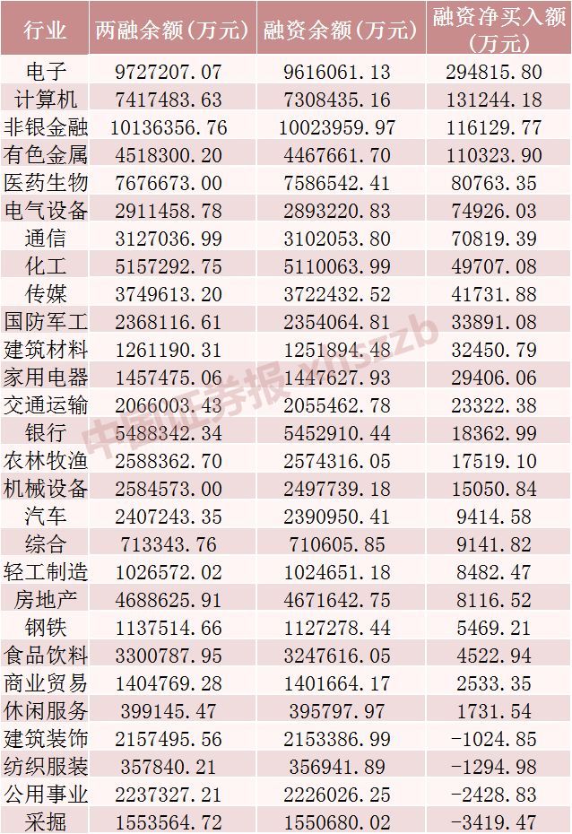 Wind数据显示,在2月17日,融资客对申万一级28个行业中的24个行业板块进行了加仓,融资净买入居前的行业为电子、计算机、非银金融行业,分别净买入29.48亿元、13.12亿元、11.61亿元。此外,有色金属行业的净买入金额也超过了10亿元。仅有采掘、公用事业、纺织服装、建筑装饰行业小幅减仓。