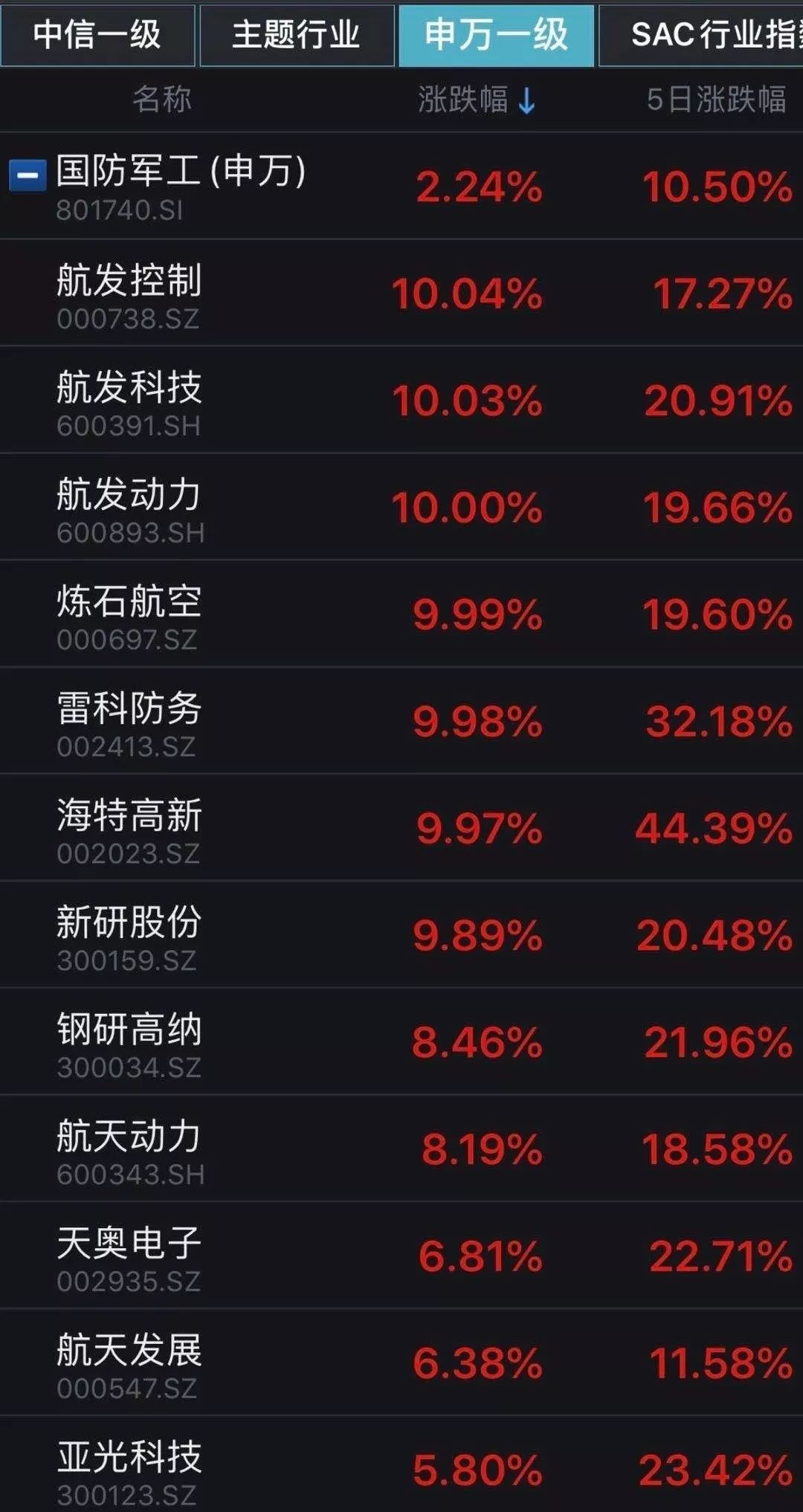 从持续领涨的国防军工板块情况来看,截至午间收盘,国防军工板块内航发控制、航发科技、航发动力、炼石航空、雷科防务、海特高新、新研股份等涨停。