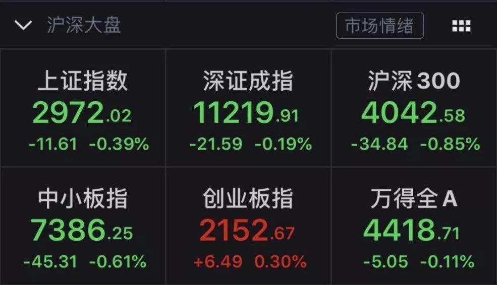 今日早盘,两市冲高回落,盘中创业板指最大涨幅超过1%。截至午间收盘,上证指数下跌0.39%,报2972.02点;深证成指下跌0.19%至11219.91点,创业板指上涨0.30%,报2152.67点。上证指数早盘最高点位为2990.60点,3000点关口前市场展开震荡。
