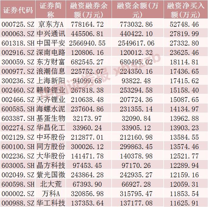 从昨日融资客加仓前20的个股情况来看,科技股是融资客重点加仓的部分,如京东方A、中兴通讯、深南电路、浪潮信息、晶方科技、紫光国微等均为科技股,其中对京东方A加仓金额达5.27亿元。