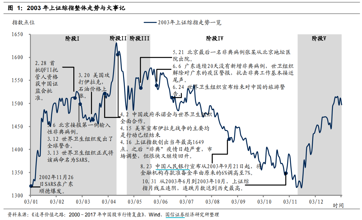 回顾2003年非典疫情发展进程,可大概将2003年的市场行情分为以下五个阶段: