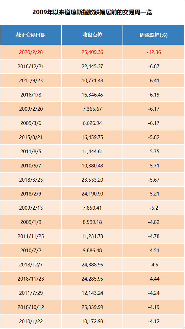 本周(2月24日至2月28日)美股创2009年以来的最差一周表现,这一周道指累计跌近3600点,跌幅12.36%;纳指累计跌超1000点,跌幅10.54%;标普500指数累计跌近400点,跌幅11.49%。