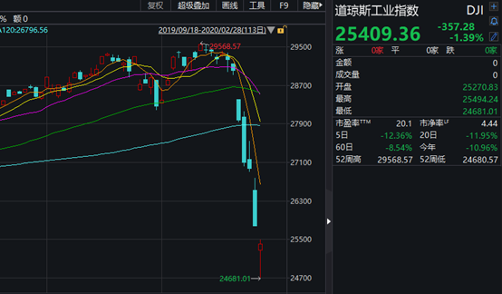 截至收盘,道指跌357.28点,跌幅1.39%,报25409.36点,该指数一度低至24681.01点,较周四下跌超过1000点。