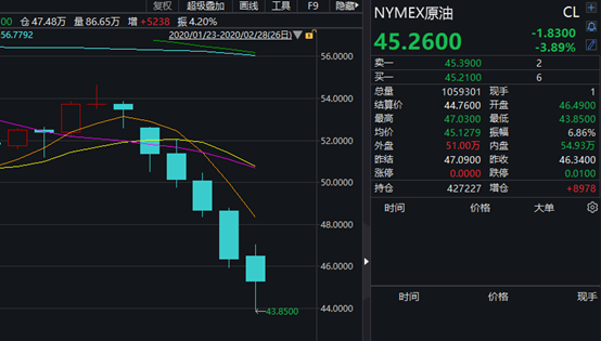 原油方面,NYMEX原油期货主力合约大跌3.89%,报45.26美元/桶,周跌幅高达15.2%。