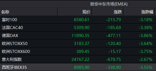欧股三大股指方面,德国DAX指数跌近4%,周跌12.44%,月跌8.41%;英国富时100指数跌3.18%,周跌11.12%,月跌9.68%;法国CAC40指数跌3.38%,周跌11.94%,月跌8.55%。