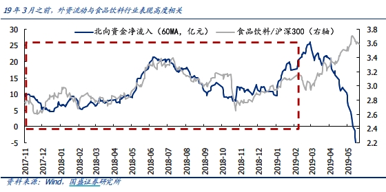 选取食品饮料指数除以沪深300的比值,以该数据过去几年与北向资金的净流入规模非常吻合。在外资大幅流入时,如2018年5、6月以及今年年初,食品饮料均取得显著的超额收益;而当外资流入放缓时,食品饮料板块则涨幅落后。