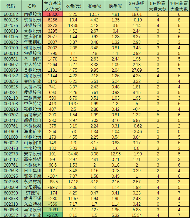 从市场表现来看,钢铁板块38只交易中的成份股全线上涨,其中,南钢股份、首钢股份、重庆钢铁等3只个股均以涨停报收,另外,金岭矿业(6.51%)、凌钢股份(5.61%)、韶钢松山(5.03%)等个股涨幅均超过5%。
