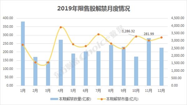 今年四季度A股市场解禁市值为9525.88亿元,月均解禁规模3175.29亿元,显著高于2785.06亿元的年内月均解禁市值。其中,10月份解禁市值3286.32亿元为年内次高峰,11月份解禁股数281.99亿股,同样为年内次高峰。