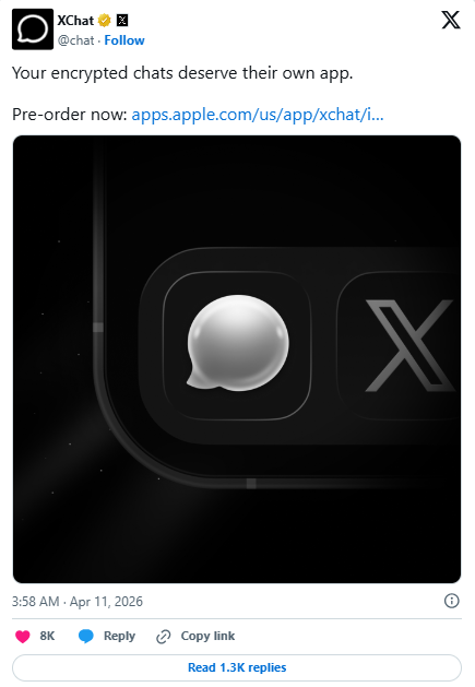 马斯克去年曾在X上公开表示,将推出全新的XChat,具备加密、阅后即焚以及发送任何类型文件的功能,并支持音频/视频通话。