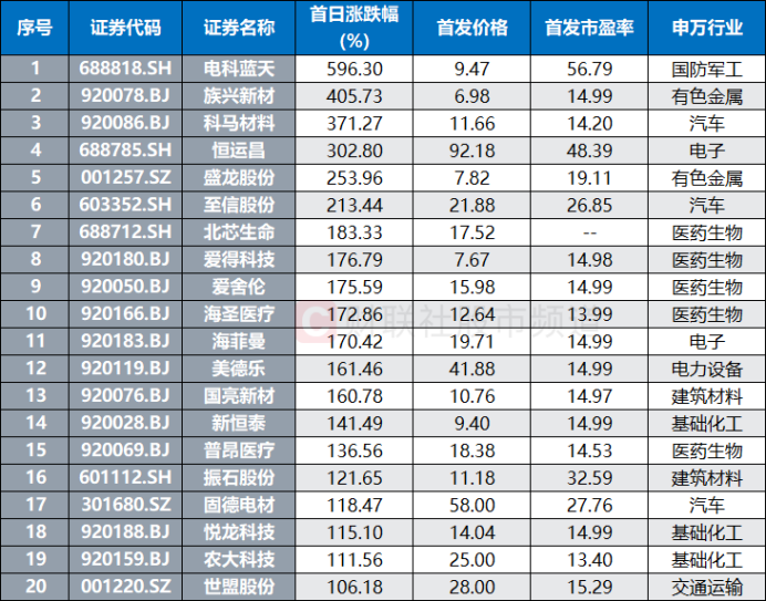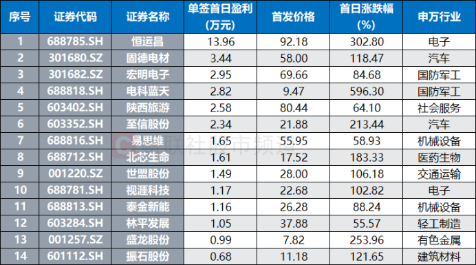 首日盈利数据方面,仅统计沪深新股,以单签500股计算,一季度上市新股首日单签平均盈利2.7万元。其中,恒运昌为近年来的“大肉签”,首日单签可赚13.96万元,固德电材、宏明电子、电科蓝天、陕西旅游、至信股份单签盈利水平也相对价格,而振石股份、盛龙股份唯二单签盈利不足万元。
