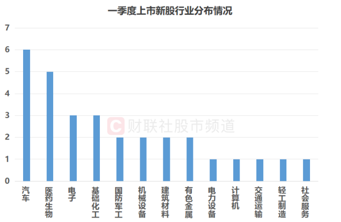 分行业板块来看,一季度上市的个股中,汽车、医药生物、电子、基础化工股数量相对较多,分别占比20.0%、16.7%、10.0%、10.0%,同时还涵盖国防军工、机械设备、建筑材料、有色金属、电力设备、计算机、交通运输、轻工制造、社会服务板块。