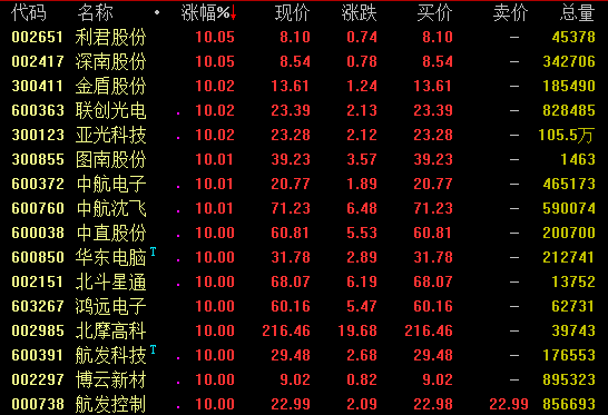 近日表现活跃的军工板块6日盘中再度爆发,截至发稿,利君股份、深南股份、金盾股份、联创光电、亚光科技、中航电子、中航沈飞、北斗星通、航发科技、博云新材、精准信息等涨停。值得注意的是,北斗星通、精准信息已连续四个交易日涨停。