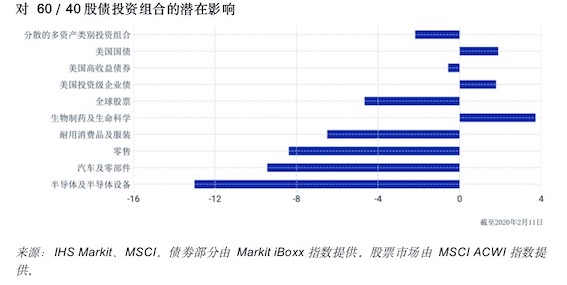 在今年2月初,MSCI也进行了一个压力测试,但当时疫情的影响还仅限于中国。根据当时MSCI在1月20日至2月5日的压力测试显示,一个分散化的60/40股债投资组合可能会损失约2%,全球股市的跌幅略小于5%。此外,国债的涨幅为2%。就特定行业板块来说,相关影响程度不一,如全球半导体及半导体设备行业或亏损13%,而全球制药、生物技术和生命科学行业则上涨略低于4%(目前鉴于市场跌幅扩大,因此组合的假设跌幅也将出现变化)。