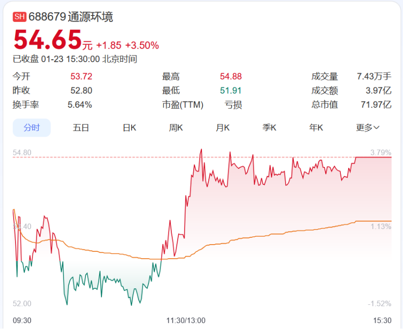 今日(1月23日),通源环境股价再度大幅上涨,盘中报54.65元/股,涨幅达3.50%,创历史新高。