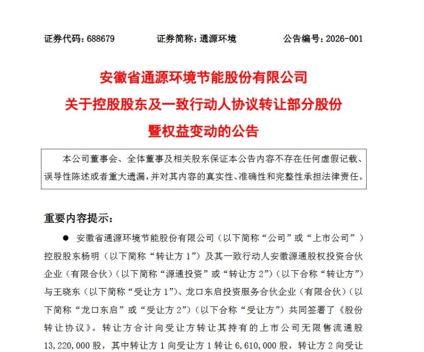 1月9日晚间,通源环境发布公告称,公司控股股东杨明及其一致行动人以每股22.16元的价格,向王晓东及龙口东启投资服务合伙企业(有限合伙)(以下称“龙口东启”)转让1322万股股份,约占公司总股本的10.04%,交易总金额2.93亿元。其中,王晓东受让793.20万股,对应持股比例约为6%,龙口东启受让528.80万股,对应持股比例约为4.04%。