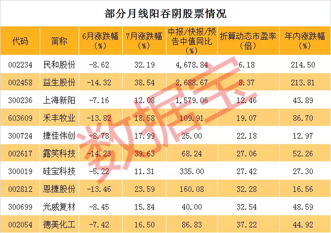 五穷六绝七翻身,今年并没有得到印证。上证指数7月份下跌1.56%,而创业板指数在科创板开闸影响下,表现相对强势,7月份累计上涨3.9%。不过,一批股票却实现了大翻身,月线实现大阳线吞没大阴线的走势。