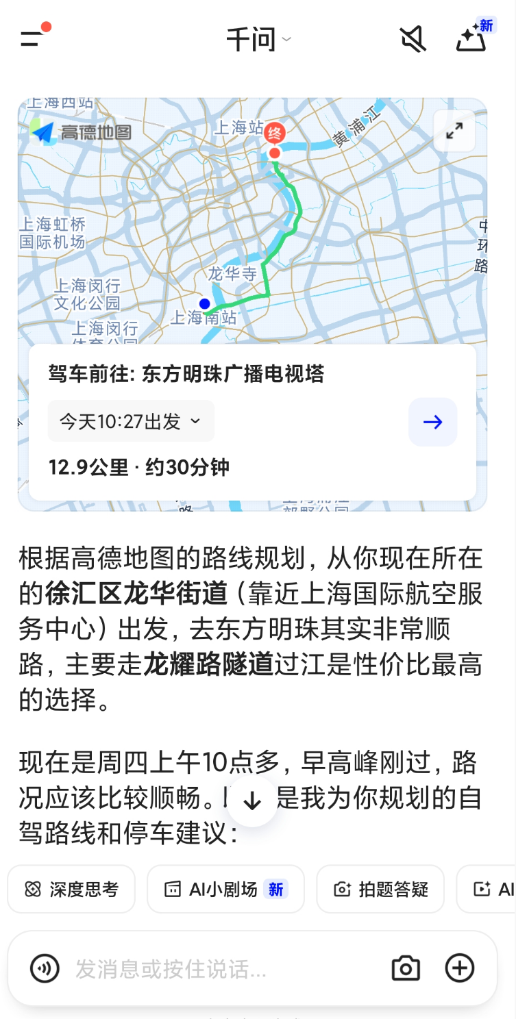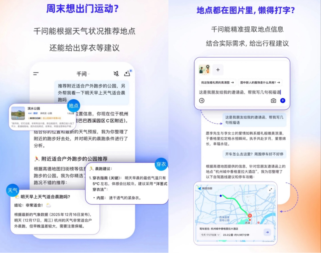 12月18日,千问App开始接入高德。接入高德后的千问AI助手,开始具备物理世界的理解和行动能力。千问不再仅限于回答问题,更能根据精准、动态的现实世界信息,实现从“意图理解”到“服务执行”的跨越。
