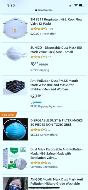 美国电商网站上的口罩价格纷纷上涨,还很难买到。