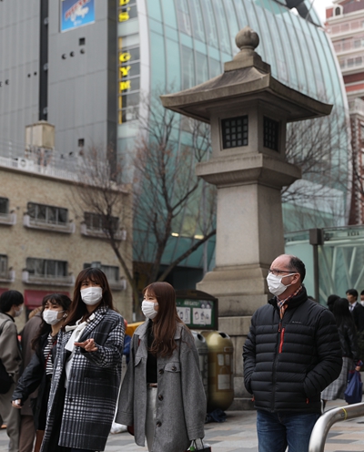 2月25日,在日本东京,人们戴口罩出行。新华社