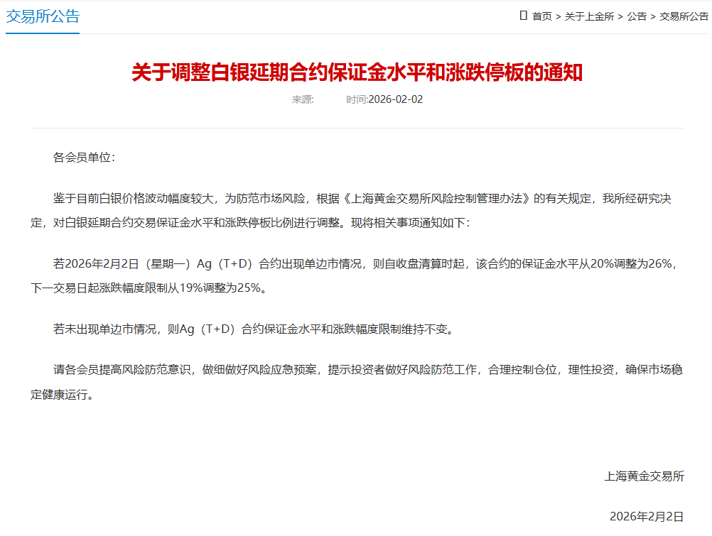 若2026年2月2日(星期一)Ag(T+D)合约出现单边市情况,则自收盘清算时起,该合约的保证金水平从20%调整为26%,下一交易日起涨跌幅度限制从19%调整为25%。