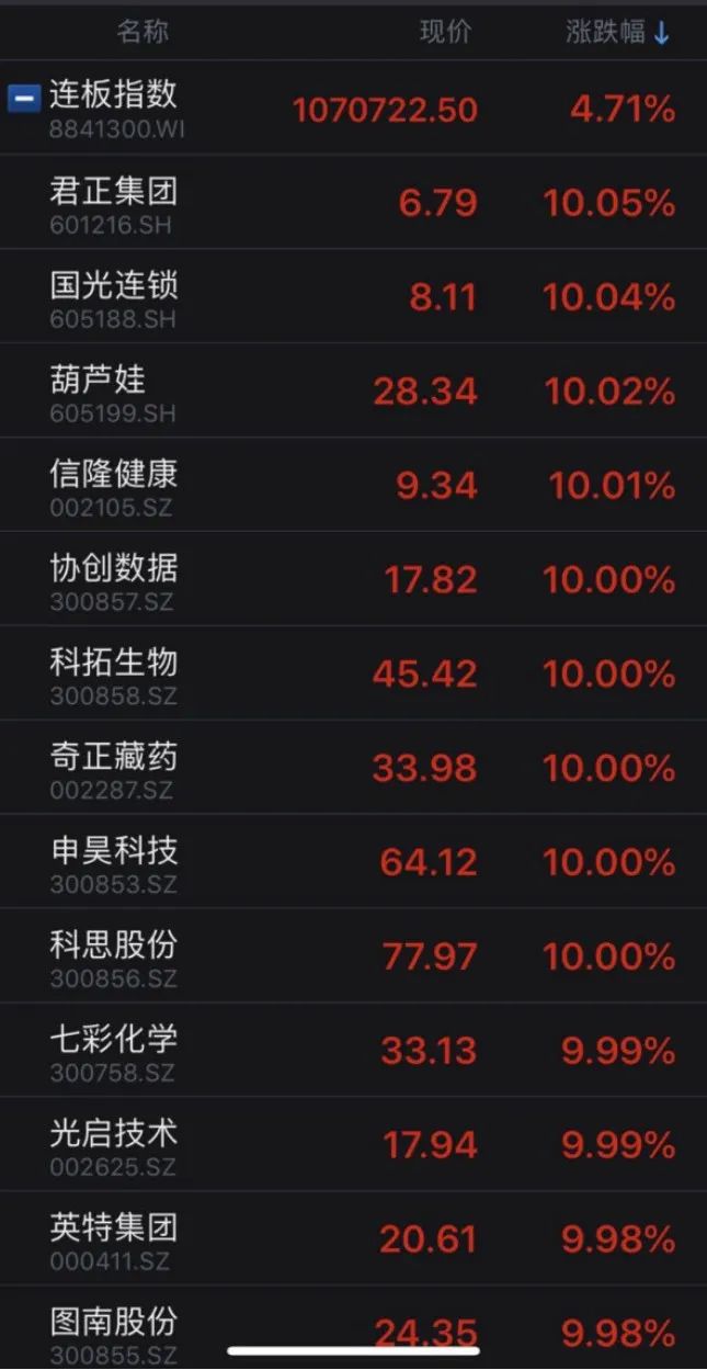 今日两市下跌个股超过2300只,涨停个股113只。剔除未开板新股,英特集团“五连板”,奇正藏药、七彩化学、光启技术“四连板”,君正集团、信隆健康“三连板”。分析人士表示,从涨停个股数及连板个股情况来看,市场情绪并未显著消退,人气还不错。