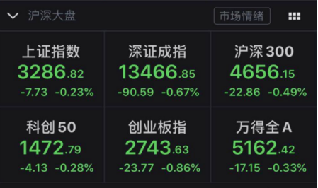 今日两市高开后震荡调整,上证指数在3300点争夺激烈,盘中八上八下,最终失守3300点。截至收盘,上证指数下跌0.23%,报3286.82点;深证成指下跌0.67%,报13466.85点;创业板指下跌0.86%,报2743.63点;科创板50指数下跌0.28%,报1472.79点。