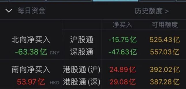 Wind数据显示,今日北向资金全天净流出63.38亿元,其中沪股通资金净流出15.75亿元,深股通资金净流出47.63亿元。
