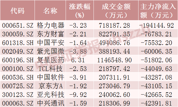 主力资金净流出金额居前的个股为格力电器、东方财富、中国平安,分别净流出19.41亿元、7.68亿元、7.55亿元。