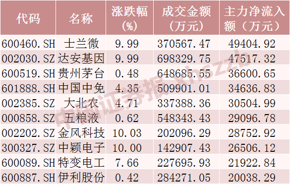 从个股情况看,今日主力资金净流入金额居前的为士兰微、达安基因、贵州茅台,分别净流入4.94亿元、4.75亿元、3.66亿元。