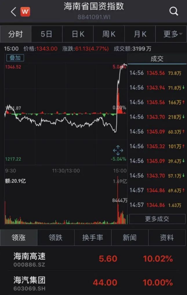 概念板块方面,海南省国资、水产、风力发电等板块涨幅居前,光刻胶、百度概念、数字货币等板块跌幅居前。涨幅居前的海南省国资板块尾盘出现直线拉升,海南高速、海汽集团均在尾盘从下跌直线拉升至涨停。