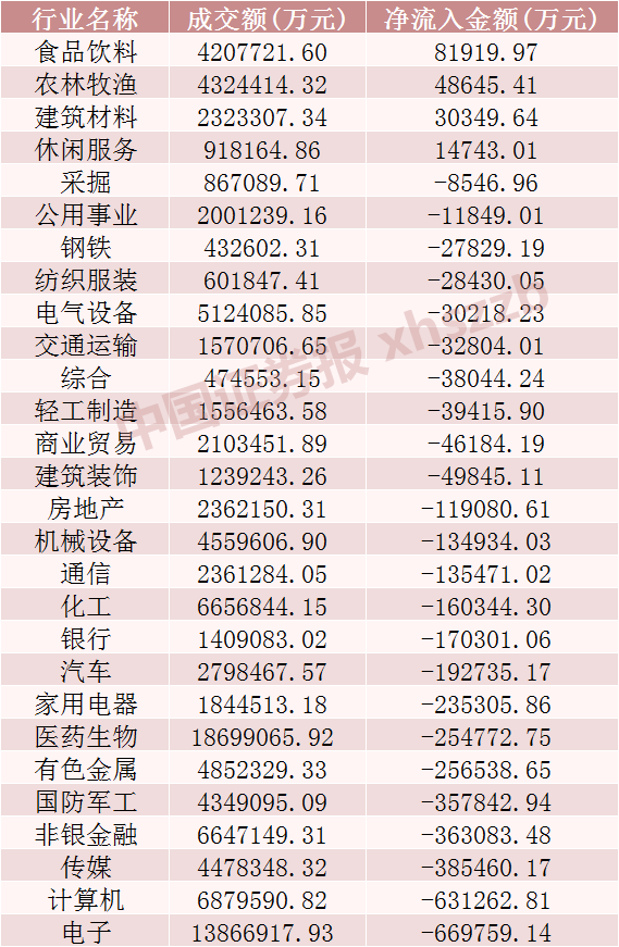 从行业来看,申万一级28个行业仅有食品饮料、农林牧渔、建筑材料、休闲服务行业出现主力资金净流入,金额分别为8.19亿元、4.86亿元、3.03亿元、1.47亿元;其他行业板块均出现主力资金净流出,其中电子、计算机、传媒板块主力资金净流出金额达66.98亿元、63.13亿元、38.55亿元。