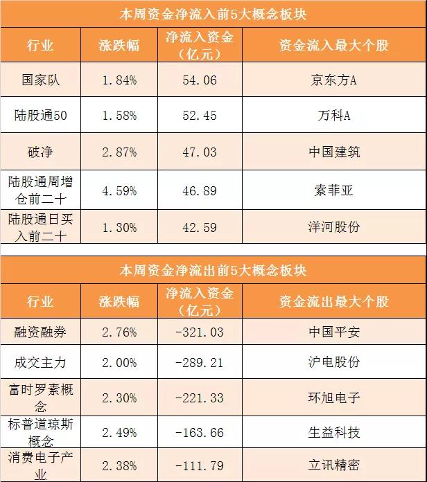 概念板块方面,本周国家队、陆股通50、破净等概念板块资金呈现净流入,其中国家队概念净流入54.06亿元居首。