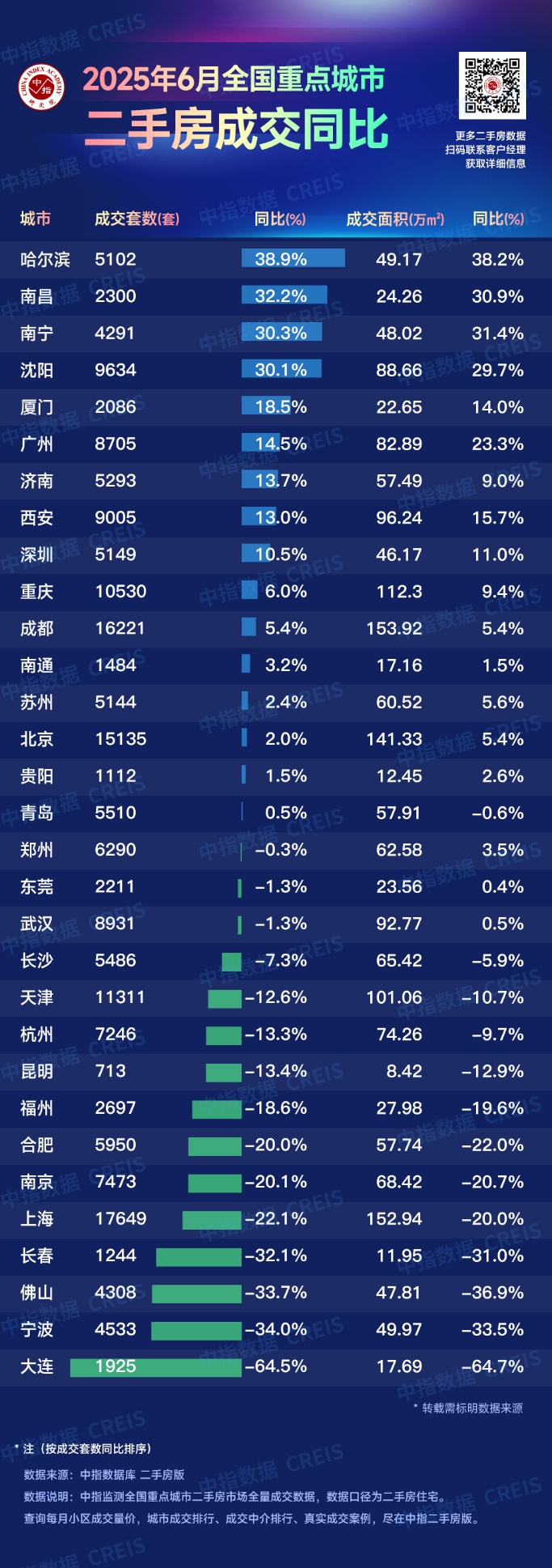 根据中国房地产指数系统百城价格指数,2025年6月,百城二手住宅均价环比下跌0.75%,同比下跌7.26%;十大城市二手住宅均价环比下跌0.60%,同比下跌5.29%,同比跌幅收窄0.1个百分点。